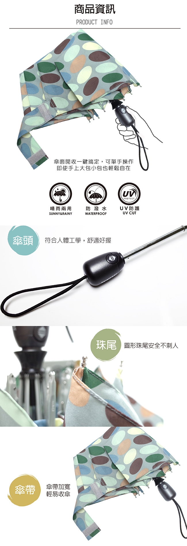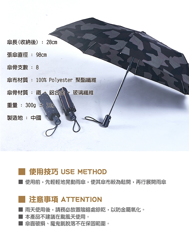 商品規格 品牌 : RAINSTORY 顏色 : 灰色系, 紫色系 風格元素 : 花草蔬果 傘布主材質 : 100%Polyester 傘布材質說明 : 鐵+鋁合金+玻璃纖維 傘骨主材質 : 鋁合金 樣式 : 三折傘 開收方式 : 自動開收 傘把造型 : 直把 收傘尺寸(cm) : 28 開傘尺寸(cm) : 54 張傘直徑(cm) : 98 傘骨支數 : 8 重量(g) : 300 用途功能 : 抗UV 產地 : 中國 體驗說明 使用方法說明 請參照商品吊牌或網頁上之說明 注意事項 1、雨天使用後,請務必放置於陰暗處晾乾,以防金屬氧化。 2、本產品不建議在颱風天使用。 3、傘面破損、魔鬼氈脫落不在保固範圍內。