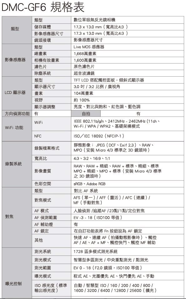 全新180 翻轉觸控螢幕 內建Wi Fi NFC功能 1 600萬像素 19款創意濾鏡 感光元件像素 1668萬像素有效像素 1600萬像素感光元件大小 17 3x13 0mm感光元件種類 C 售價:6990